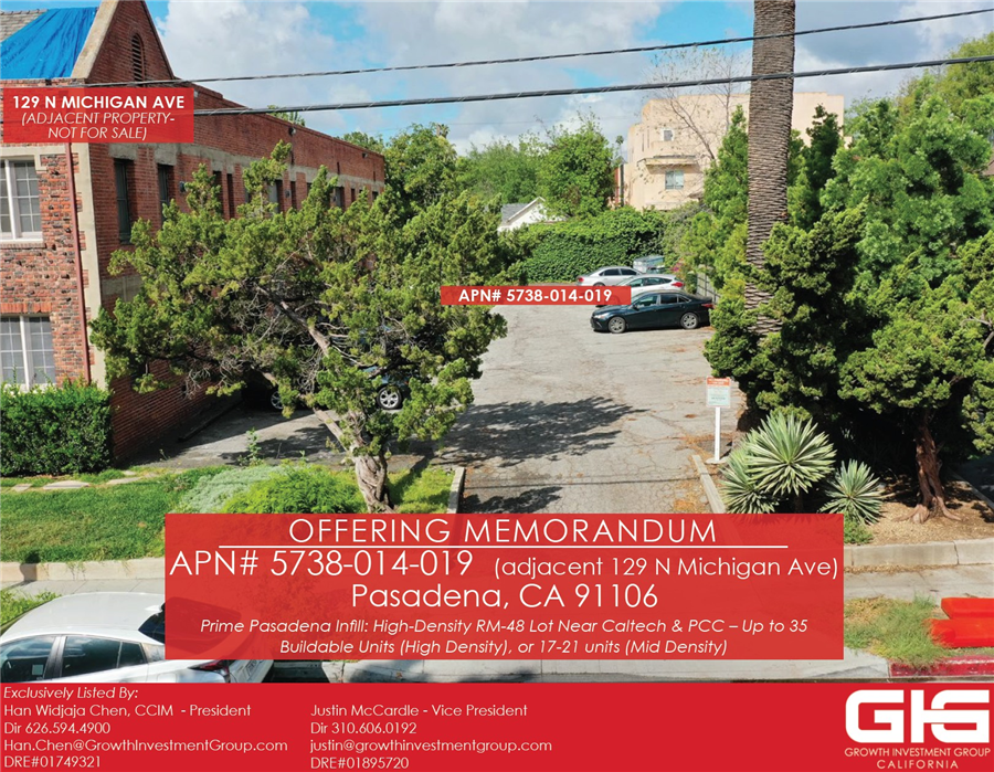 Growth Investment Group California is proud to present a rare infill opportunity on N Michigan Avenue: a 7501SF, RM-48 high-density lot located mere steps from Caltech and Pasadena City College. Because this site is a vacant lot, developers benefit immediately from zero demolition costs, allowing for a faster, more cost-effective path to vertical construction in one of Southern California’s most supply-constrained markets.