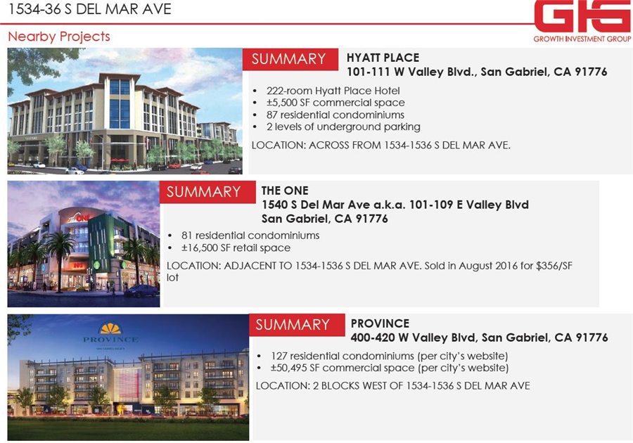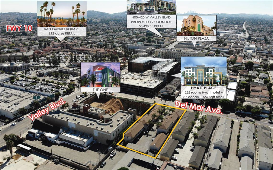 Hyatt Place which is across the street from subject property is a 222-rooms Hyatt Hotel and 87 condominiums that is currently under construction. The One which is adjacent to subject property is 81 condominiums and retail that is currently under construction. 400 W Valley Blvd is another proposed project for 197 condominiums and ±50k square foot retail is just two blocks away. These are in addition to Hilton Hotel, Sheraton, and San Gabriel Square shopping center which are all within walking distance from subject property. Freeway 10 is several blocks south of the property and connects it with downtown Los Angeles and other parts of greater LA.