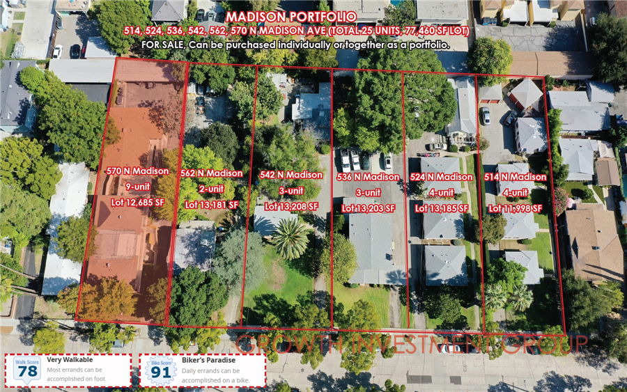MADISON PARK PORTFOLIO – True Value-Add SIX (6) Properties Side-by-side For Sale, Great Location Several blocks north of Old Town Pasadena, Large Combined Lot Size of 1.78ACRE, Overparked Portfolio. Can be purchased individually or together.