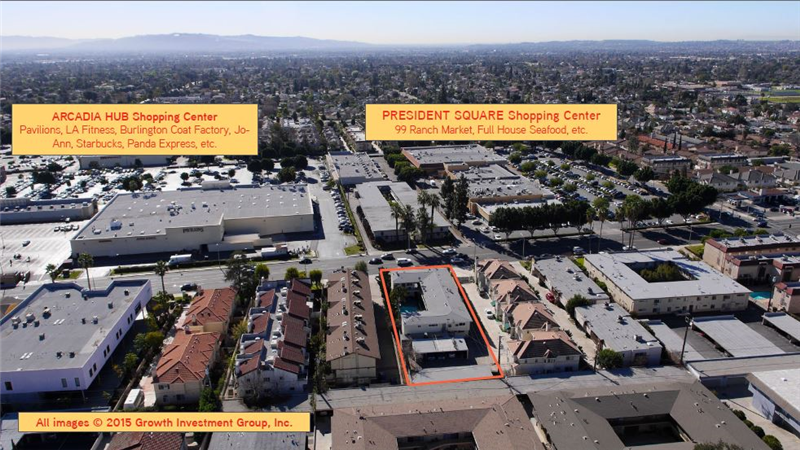 It is located right across the street from two (2) major shopping centers in the area; ARCADIA HUB Shopping Center, a ±256,000sqft power center anchored by national retailers such as Pavilions, LA Fitness, Burlington Coat Factory, Jo-Ann, Starbucks, Panda Express, and moms and pops retail stores; and PRESIDENT SQUARE Shopping Center, a community shopping center anchored by 99 Ranch Market (a popular Asian supermarket chain) and multiple restaurants. It is surrounded by multiple residential townhouses on its west and east sides.